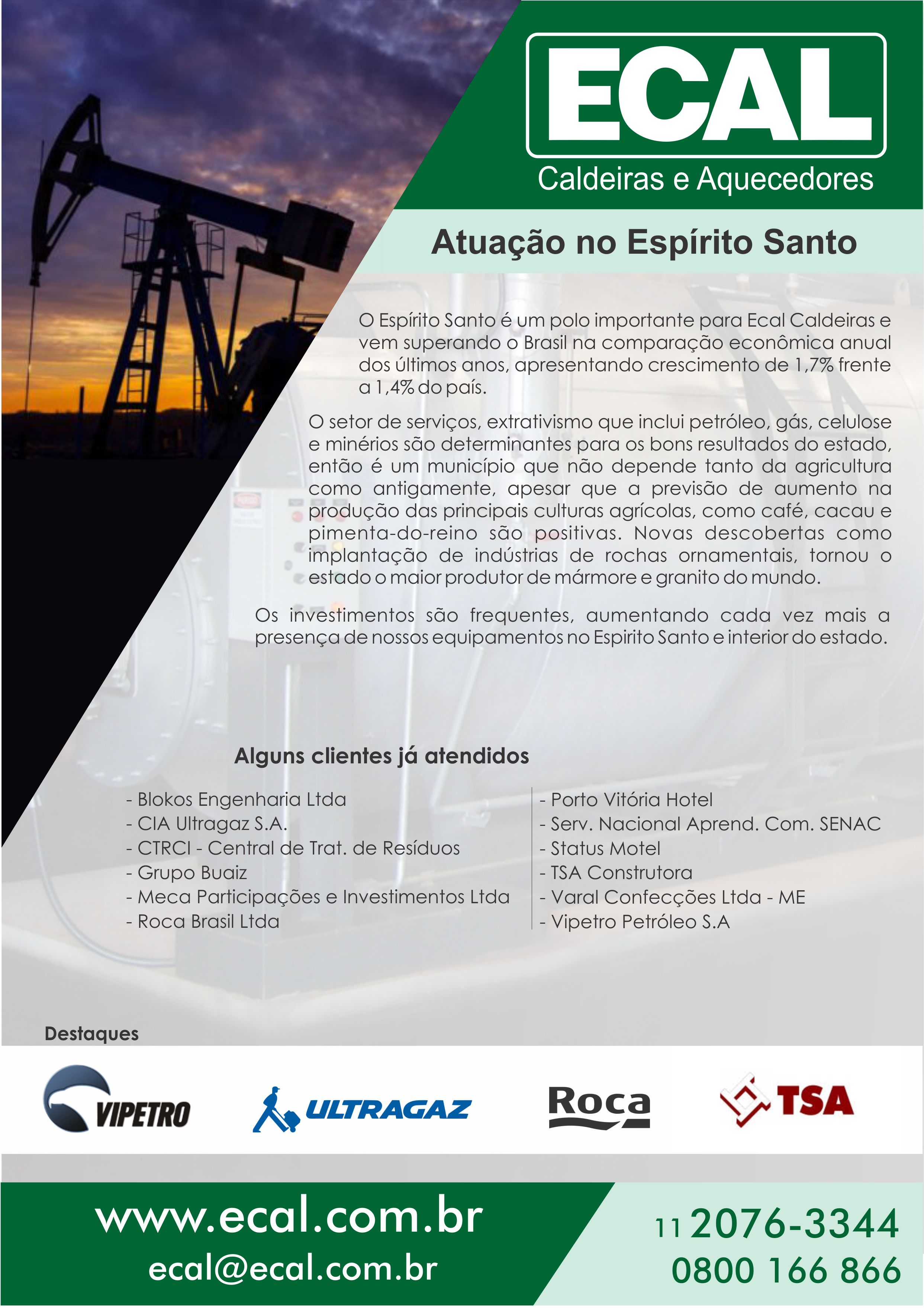 O Espírito Santo é um polo importante para a Ecal Caldeiras e vem superando o Brasil na comparação econômica anual dos últimos anos, apresentando crescimento de 1,7% frente a 1,4% do país.